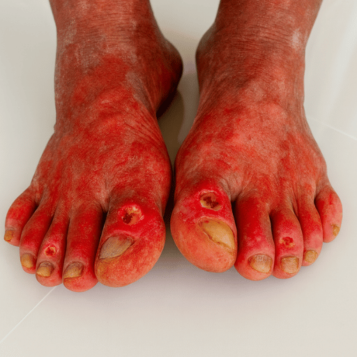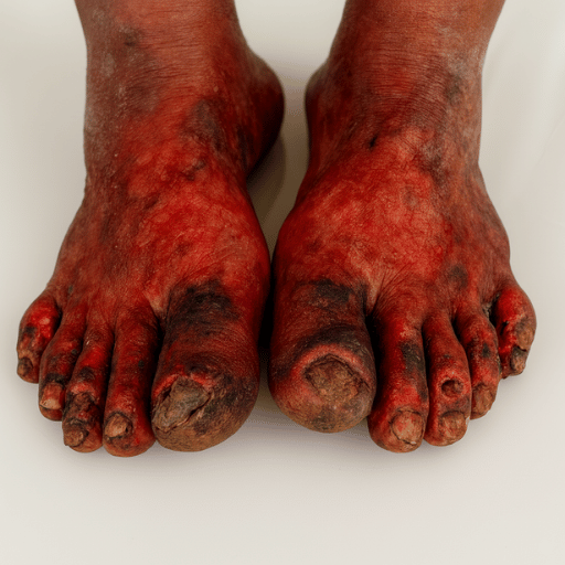 Severe ulcers and infections spread. Skin breaks open, deep wounds form, and mobility collapses. Amputation looms as the final risk.